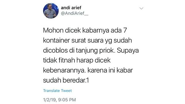 Timesindonesia jakarta wasekjen partai demokrat andi arief menanggapi santai atas berbagai tudingan yang menyebut dirinya penyebar informasi hoaks 7 kontainer surat suara pilpres 2019 yang dicoblos untuk pasangan capres cawapres nomor urut 01. Kpu memastikan bahwa kabar terkait 7 kontainer surat suara tercoblos yang masuk melalui pelabuhan tanjung priok adalah kabar bohong. Kabid humas polda metro jaya kombes argo yuwono mengatakan pihaknya akan mencari tahu pelaku yang pertama kali menyebarkan informasi tersebut.